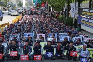 کرێکارەکانی سەر بە سەندیکا لە شەریکەی هیوندای بۆ پیشەسازیە قورسەکان، مانگرتن و کار ڕاگرتنێکی ٤ کاتژمێریان ئەنجامدا لە بەردەم ئۆفیسی سەرەکی هیوندای لە سیۆلی پایتەختی کۆریای باشوور. خۆپیشاندانەکە بۆیە ئەنجامدرا، چونکە شەریکەی هیوندای لەبەرنامەیدایە کە نیوەی شەریکەکەی تێکەڵ بکات لەگەڵ شەریکەیەکی بچووکی ناوخۆیی درووستکردنی کەشتی.